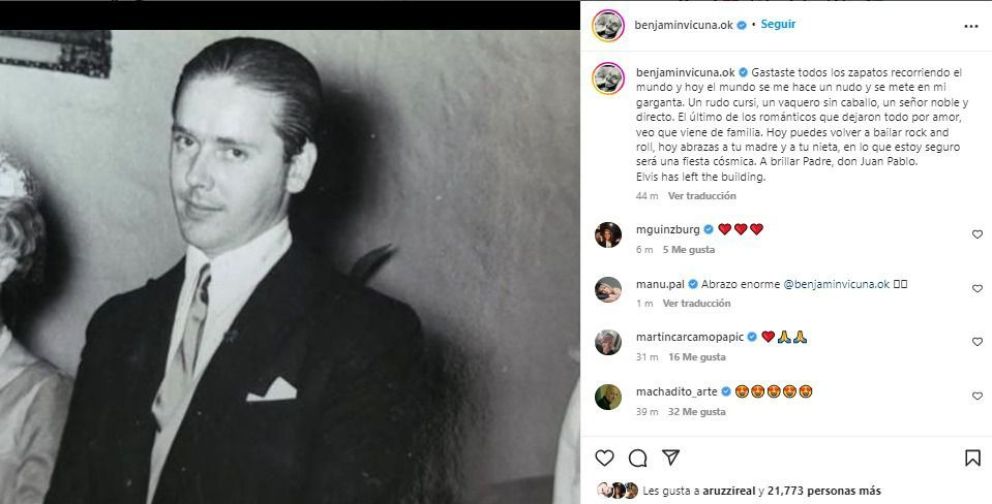 Por último, el actor desde su país y junto a una foto de su padre finalizó: "Hoy puedes volver a bailar rock and roll. Hoy abrazás a tu madre y a tu nieta, en lo que estoy seguro será una fiesta cósmica. A brillar padre, don Juan Pablo. Elvis has left the building".