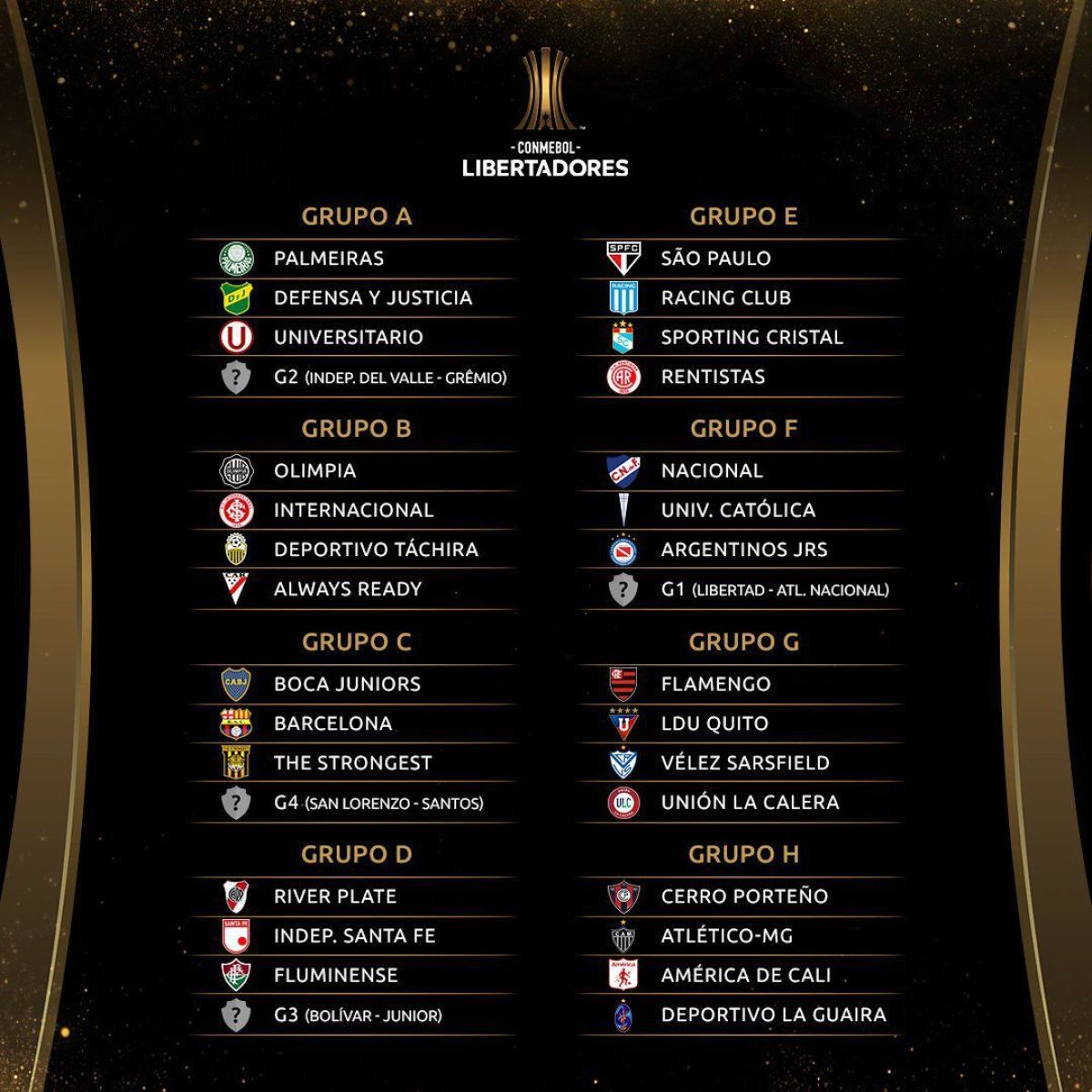 Por su parte, River encabeza el grupo D, en el que su rival más peligroso es Fluminense de Brasil, pero también se medirá con Independiente Santa Fe (Colombia) y el ganador de la llave entre Bolívar (Bolivia) y Junior de Barranquilla, el equipo en el que juega Teófilo Gutiérrez.