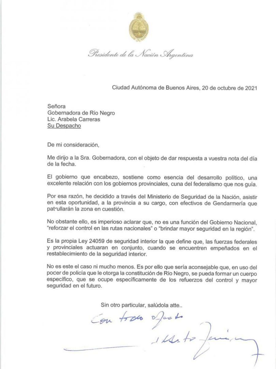 El presidente Alberto Fernández le envió una carta a la gobernadora de Río Negro, Arabela Carreras, para informarle que enviará gendarmes por la escalada de violencia generada por los mapuches. No obstante, en la misma, planteó que no es responsabilidad del Ejecutivo nacional reforzar la seguridad de la región.