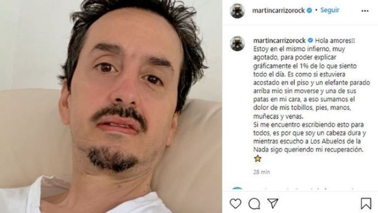 Así, por estas horas Martín Carrizo compartió un desesperado mensaje que publicó desde su cuenta de Instagram, mientras no se da por vencido y sigue buscando la cura para su enfermedad. "Hola amores!! Estoy en el mismo infierno, muy agotado, para poder explicar gráficamente el 1% de lo que siento todo el día. Es como si estuviera acostado en el piso y un elefante parado arriba mío sin moverse y una de sus patas en mi cara, a eso sumamos el dolor de mis tobillos, pies, manos, muñecas y venas", posteó el hermano de Caramelito.