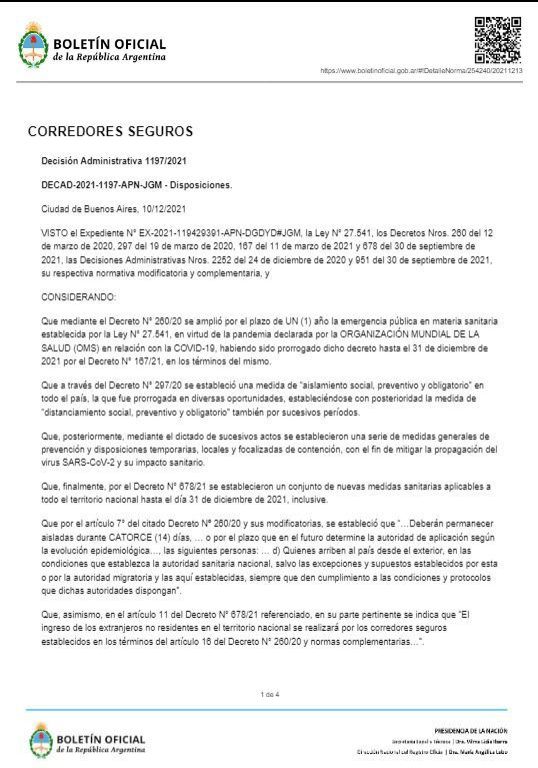 En el marco de la estrategia para contener posibles nuevos rebrotes de la pandemia de coronavirus, el Gobierno, por medio de la Decisión Administrativa 1197/2021, publicada hoy en el Boletín, dispuso "la apertura como corredores seguros internacionales en la provincia de Formosa, para el ingreso a la República Argentina".