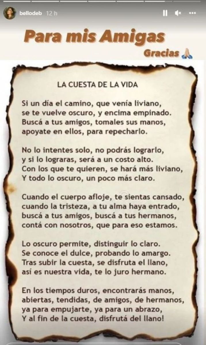 Luego de que el músico confirmara la ruptura, Débora Bello compartió a través de sus stories de Instagram un mensaje en agradecimiento a sus amigos, quienes la están acompañando en este momento tan delicado. "Si un día el camino que venía liviano se te vuelve oscuro y empinado, buscá a tus amigos, tomalos de las manos y apoyate en ellos para repecharlo", decía el posteo que compartió Débora.