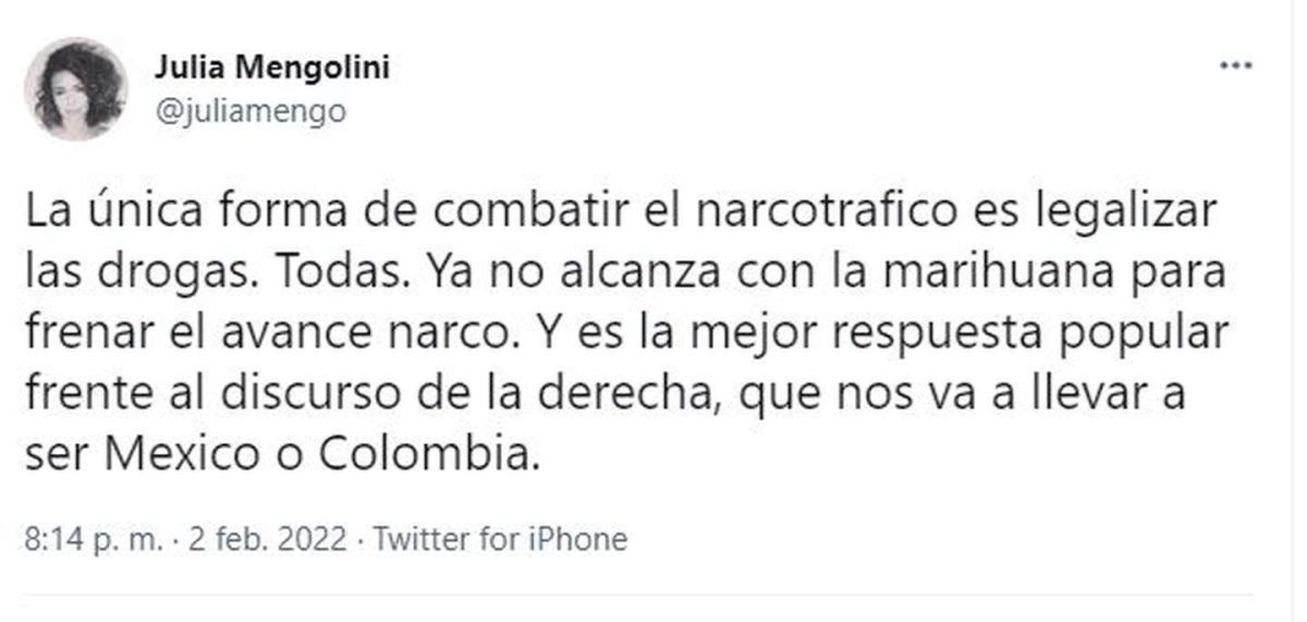 A través de sus redes sociales, pidió legalizar todas las drogas. “Ya no alcanza con la marihuana para frenar el avance narco. Y es la mejor respuesta popular frente al discurso de la derecha, que nos va a llevar a ser México o Colombia”, lanzó.