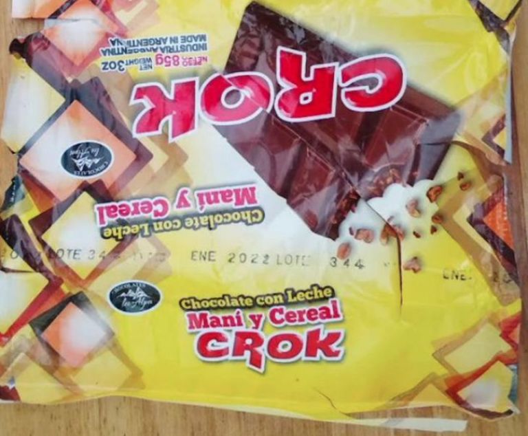 El organismo explicó que se trata del producto rotulado como "Chocolate con leche, maní y cereal; marca Crok - Chocolates Los Alpes; Peso Neto 85 g, Lote: 344, Vencimiento: Ene 2022; RNE: 02-002752, RNPA: 02-044075, Industria Argentina".