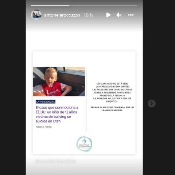 Antonela Roccuzzo publicó un fuerte mensaje en contra del Bullying después de sentirse conmovida por el caso de un nene de 12 años que se suicidó en los Estados Unidos por ser víctima de este flagelo.
