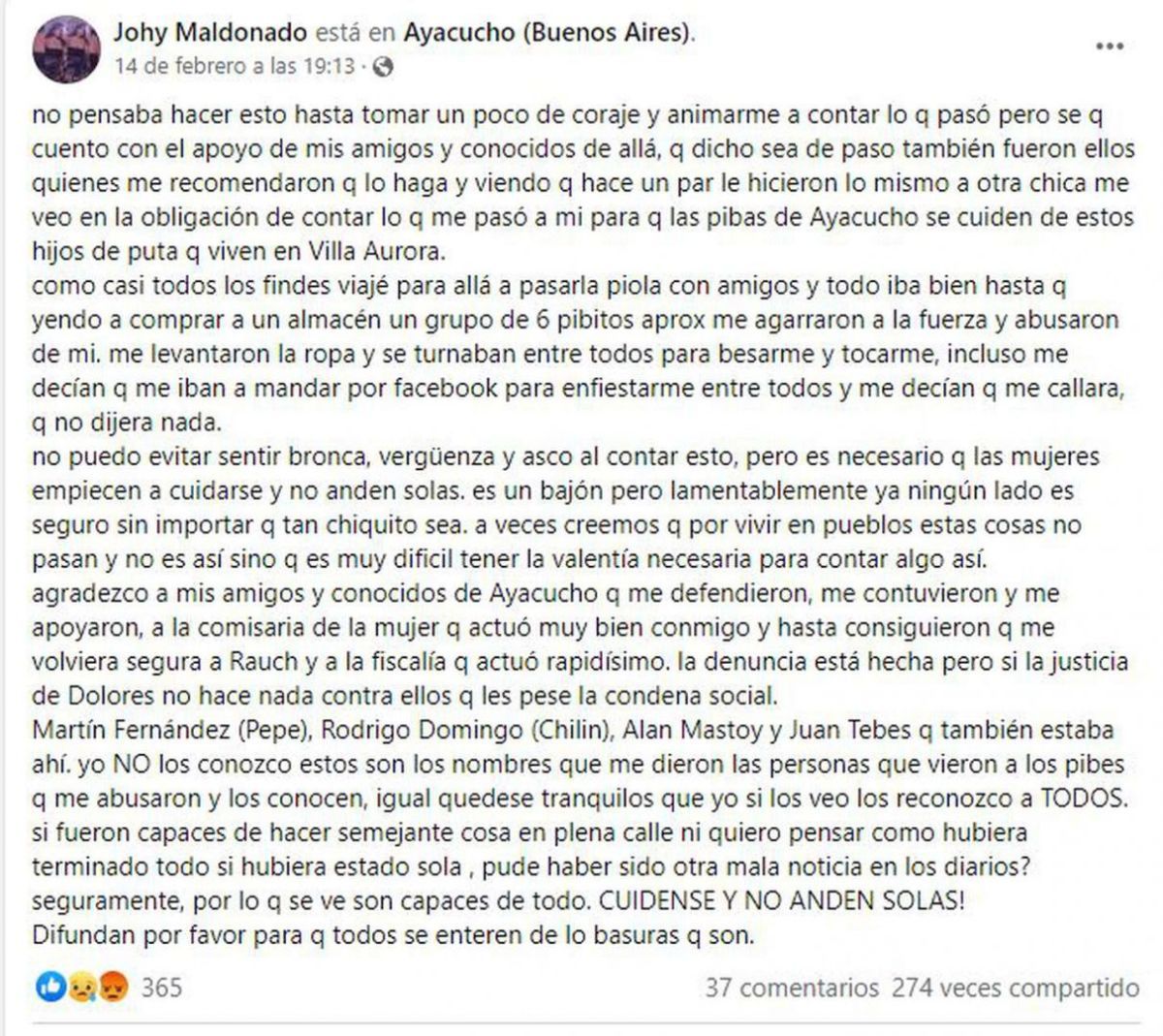 Johana Maldonado, una joven de 22 años de la ciudad de Rauch, había viajado a Ayacucho para visitar a unos amigos, pero sus planes se frustraron. De acuerdo a la denuncia, la joven sufrió un abuso sexual de seis hombres.