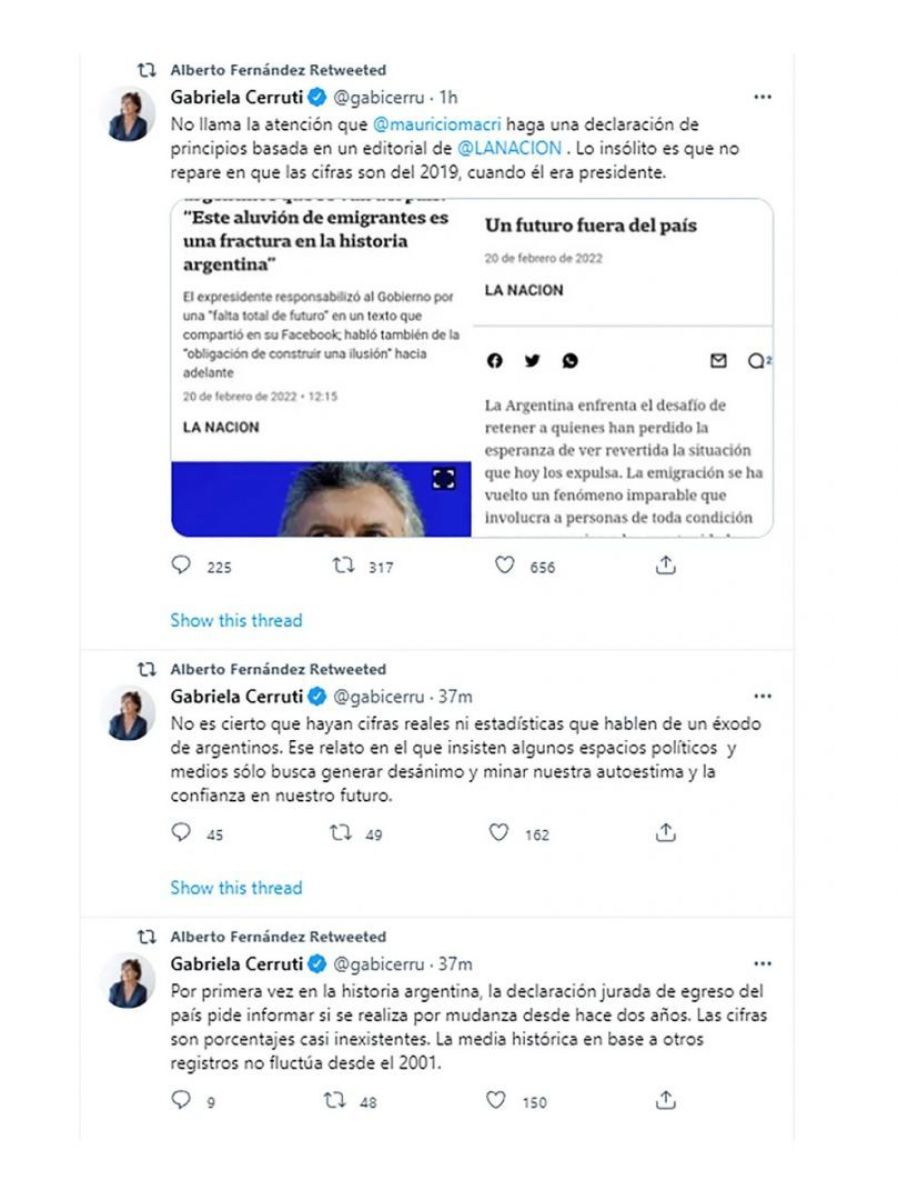 Esta mañana, Mauricio Macri publicó una carta en sus redes, donde se refirió al "aluvión" de argentinos que se van del país, que es "una fractura en la historia argentina". A través de su cuenta de Twitter, Gabriela Cerruti cuestionó al ex mandatario. Más tarde, el presidente Alberto Fernández retuiteó los dichos de su portavoz.