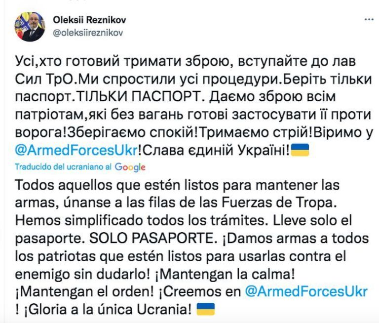 Por su parte, el ministro de defensa de Ucrania, Oleksii Reznikov, en las redes sociales expresó que los que quieran tener armas deben solicitarse solo con el pasaporte.