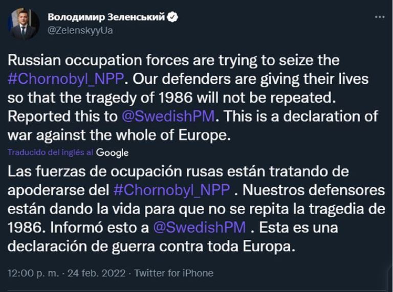 "Las fuerzas de ocupación rusas están tratando de apoderarse del #Chornobyl. Nuestros defensores están dando la vida para que no se repita la tragedia de 1986. Esta es una declaración de guerra contra toda Europa", manifestó el presidente de Ucrania, Volodímir Zelenski.