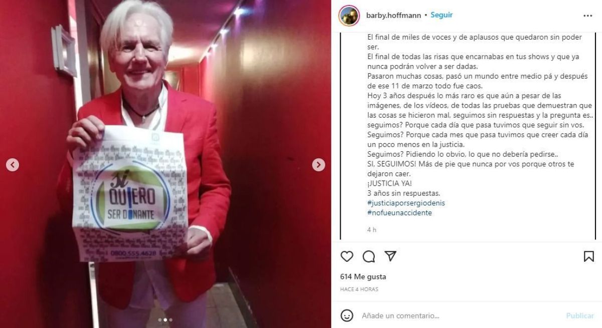 La hija del artista, Bárbara Hoffmann, se refirió al fatídico desenlace en sus redes sociales y pidió justicia por su padre. "Hace 3 años recibimos la peor de las noticias", arrancó diciendo en el texto.