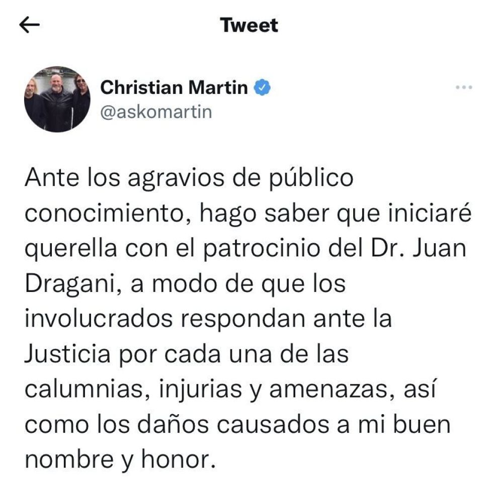 Luego de que su hermana lo denunciara públicamente por violencia de género y lo tildara de xenófobo y machista en el programa de Santiago Cúneo, el periodista y corresponsal Christian Martin aseguró, a través de su cuenta de Twitter, que llevará adelante un proceso judicial.