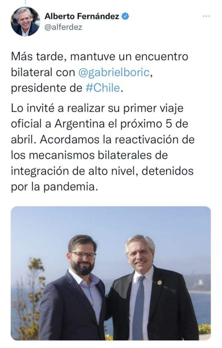 A través de un comunicado oficial que realizó en Twitter, el Presidente de la Nación expresó: "Con Boric acordamos la reactivación de los mecanismos bilaterales de integración en alto nivel que fueron detenidos por la pandemia". Además, destacó: "Lo invité a realizar su primer viaje oficial a Argentina el 5 de abril".