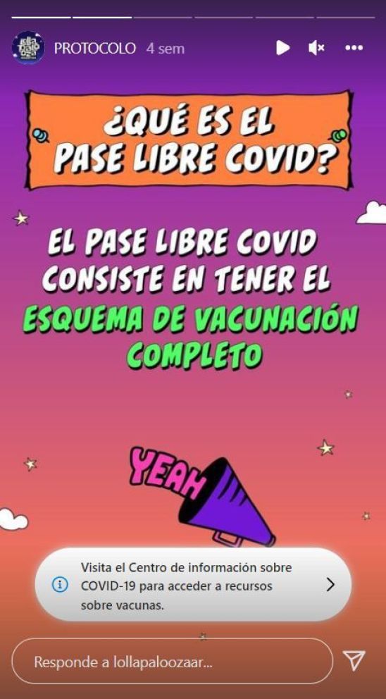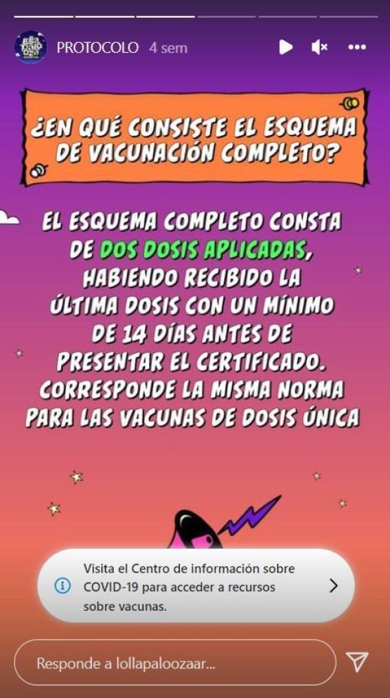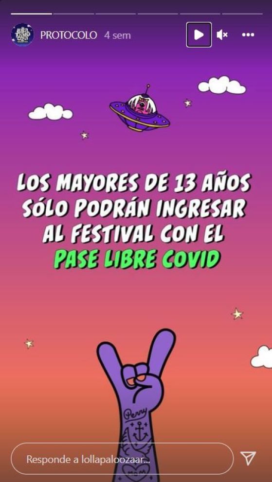En su cuenta oficial de instagram indicaron los protocolos para el ingreso. En sus historias destacadas se puede leer que cualquier persona mayor de 13 años que asista al espectáculo, deberá contar con el Pase Libre Covid con esquema de vacunación completo. Es decir, tener al menos, dos dosis aplicadas, habiendo recibido la última dosis 14 días o más, previos al comienzo del festival. Esto también aplica para los casos de vacunas de dosis única, como la vacuna CanSino, habiendo transcurrido 14 días o más desde su aplicación.