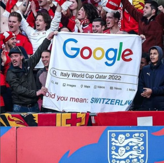 En la imagen se ve a varios hinchas sosteniendo un cartel que representa las búsquedas en Google y en la misma se lee "Italia Copa del Mundo Qatar 2022" y la corrección que hace el servidor cuando hay un error: "Quizás quisiste decir Suiza", dice.