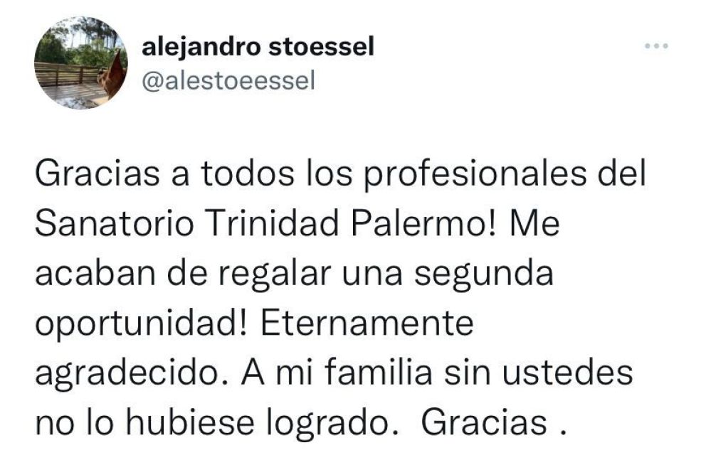 A través de su cuenta de Twitter, el papá de Tini, expresó su agradecimiento. "Gracias a todos los profesionales del Sanatorio Trinidad de Palermo. Me acaban de regalar una segunda oportunidad. Eternamente agradecido", escribió.