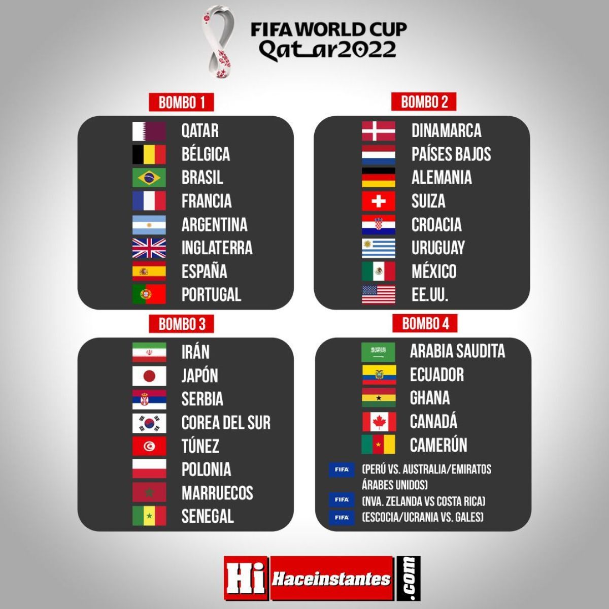 En el segundo bombo se encuentran Países Bajos, Alemania, Suiza, Croacia, Dinamarca y Uruguay. En el tercero, Irán, Japón, Serbia, Senegal, Marruecos, Polonia, Canadá y Corea del Sur. En el cuarto, Arabia Saudita, Camerún, Túnez, Ghana y Ecuador.
