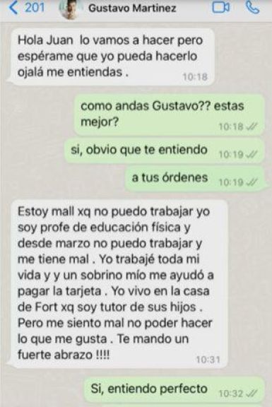 Y, a continuación, comienza a enumerar las causas de su malestar: “Estoy mal porque no puedo trabajar. Yo soy profe de educación física y desde marzo no puedo trabajar y me tiene mal. Yo trabajé toda mi vida y un sobrino mío me ayudó a pagar la tarjeta. Yo vivo en la casa de Fort poque soy tutor de sus hijos pero me siento mal al no poder hacer lo que me gusta. Te mando un fuerte abrazo”.