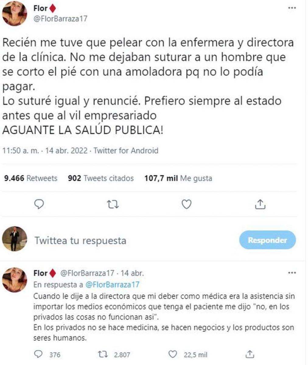 Florencia Barraza es médica, tiene 27 años y es oriunda de la Ciudad de Buenos Aires, se volvió viral luego de publicar un tuit donde contó una situación que la indignó e, incluso, la hizo renunciar al trabajo en una clínica privada.
