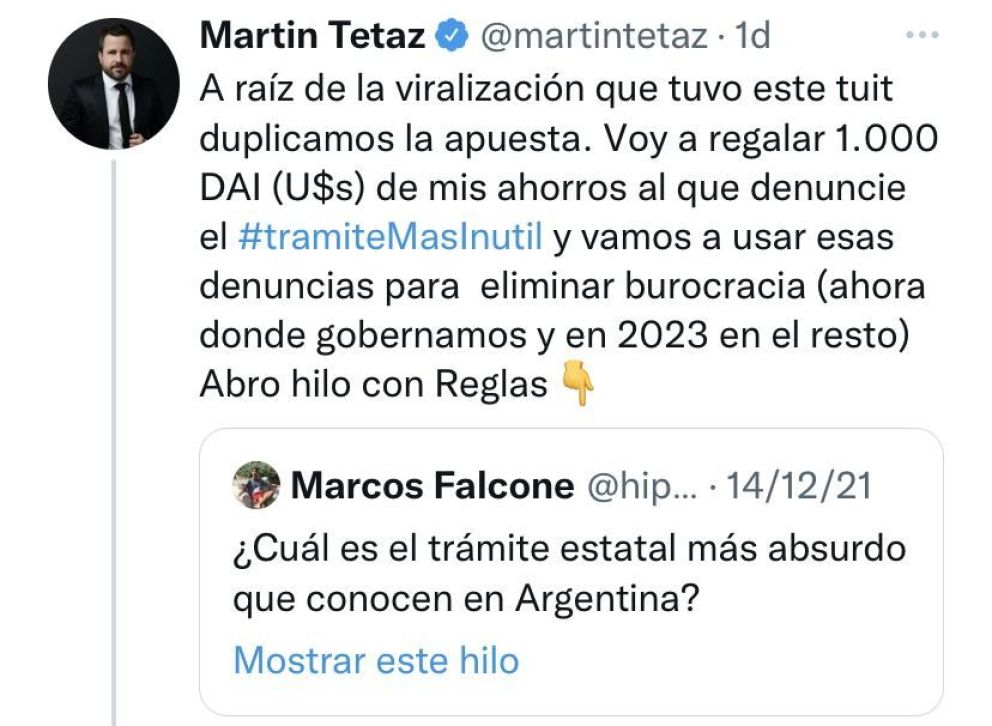 Luego de criticar duramente el funcionamiento estatal, Martín Tetaz, propuso un juego en sus redes sociales: quien encuentre y exponga el trámite más absurdo que te piden en Argentina, se llevará 1000 dólares en Criptomonedas.