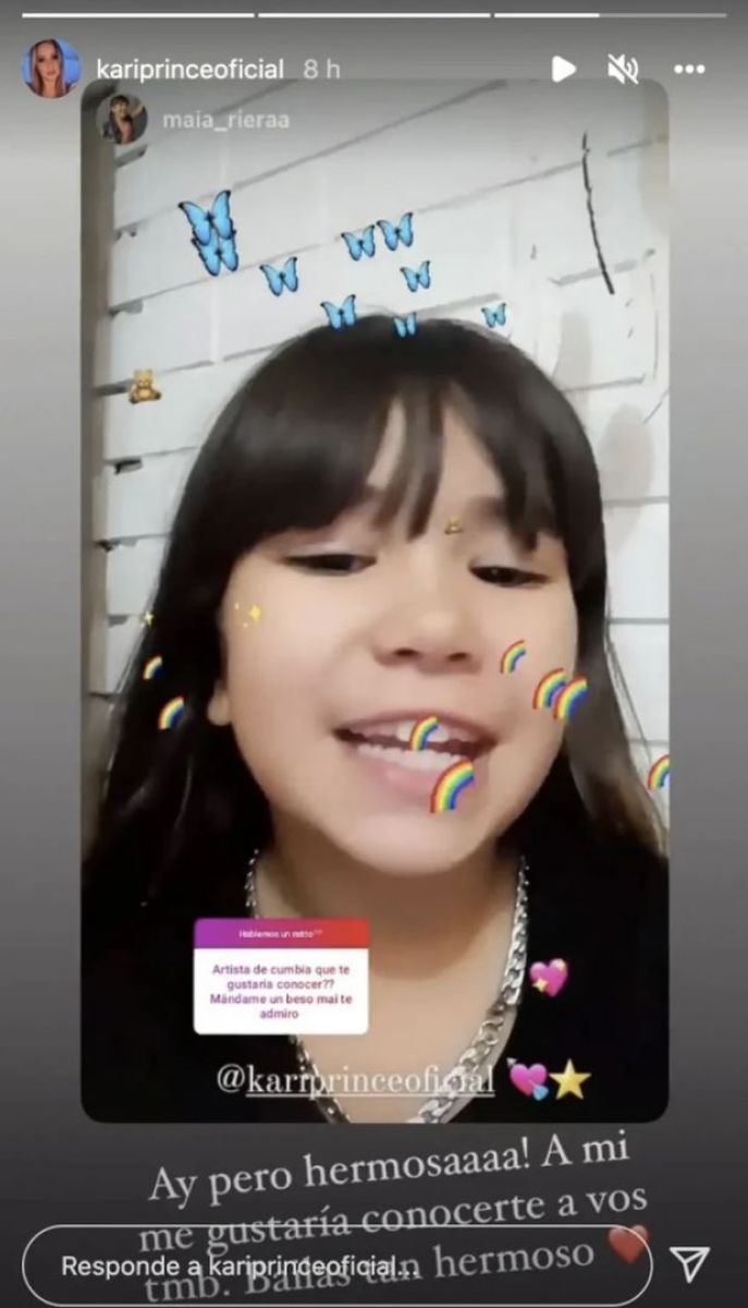 La pequeña es oriunda de Bahia Blanca y es influencer en Instagram. Cuando le preguntaron a quién admiraba, mencionó Karina. A la cantante le llegó este mensaje y decidió contestarle. "Hola hermosa, a mi me encantaría conocerte. Bailas hermoso", escribió.