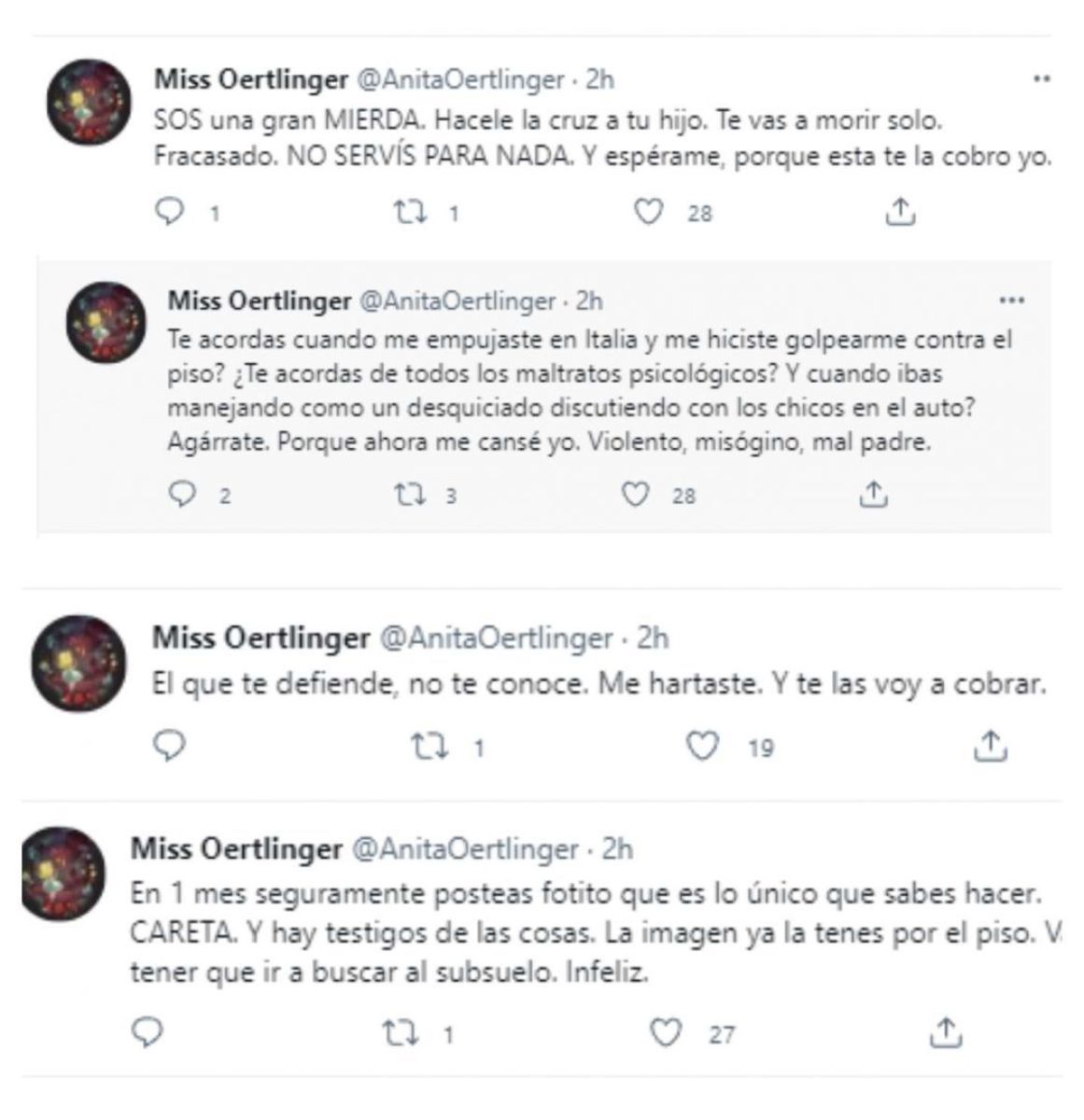 Para cerrar la cantidad de tuits, Oertlinger aseguró que tiene testigos de todas las cosas que acababa de revelar. “La imagen ya la tenés por el piso. Vas a tener que ir a buscarla al subsuelo. Infeliz”, escribió, enajenada.