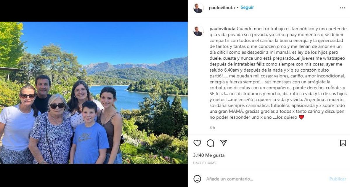 El relator deportivo Paulo Vilouta despidió el viernes a su madre Alicia. En las últimas horas, la despidió con un emotivo posteo a través de su cuenta de Instagram.