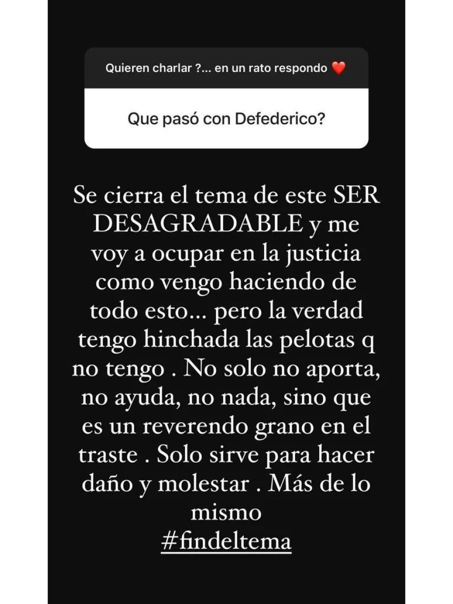 La bailarina, utilizó nuevamente sus historias de Instagram y escribió su descargo: "Ahora me voy a ocupar legalmente de vos, Matías Defederico, que el de arriba te ponga en el lugar que te tiene que poner. Violento, golpeador, deudor y mala persona. Ser deplorable si los hay en la tierra. Todo vuelve".