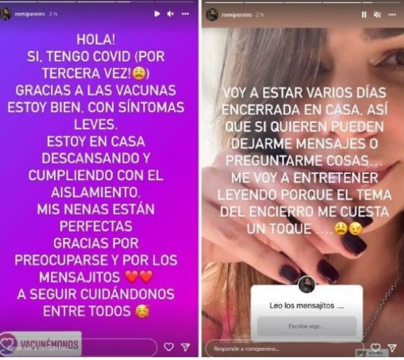 Romina Pereiro contó a través de stories de Instagram que dio positivo de coronavirus por tercera vez y transmitió tranquilidad a sus seguidores al mencionar que tanto ella como sus hijas están bien y cumpliendo con el aislamiento preventivo.