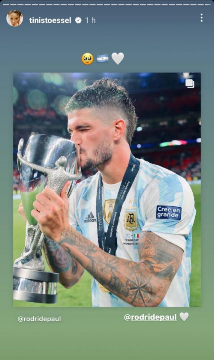 La cantante también felicitó al jugador y compartió en sus historias una foto que publicó De Paul en su cuenta oficial, sosteniendo la copa y besándola. Si bien no escribió ninguna dedicatoria, la artista etiquetó al jugador y adjuntó emojis en muestra de felicitación.