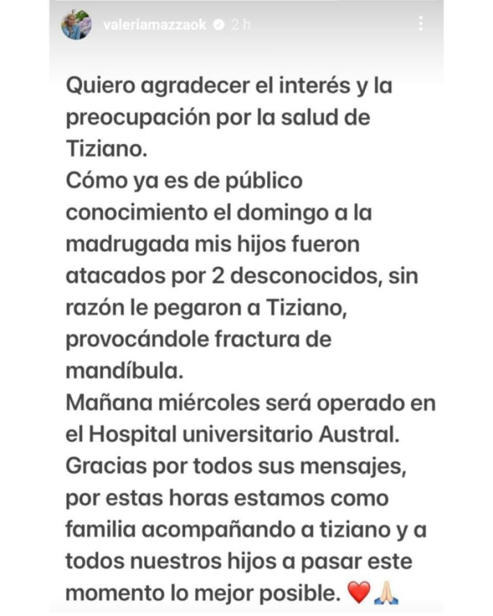 "Quiero agradecer el interés y la preocupación por la salud de Tiziano. Como ya es de público conocimiento, el domingo a la madrugada mis hijos fueron atacados por dos desconocidos", comenzó el posteo en sus historias de Instagram.