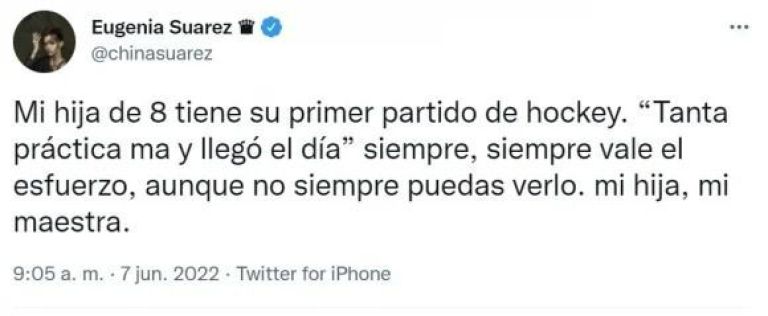 La actriz se mostró muy orgullosa en Twitter por la significativa frase que le dijo la nena antes de su primer partido de hockey: "Mi hija de 8 tiene su primer partido de hockey. 'Tanta práctica mami y llegó el día', siempre, siempre vale el esfuerzo, aunque no siempre puedas verlo"