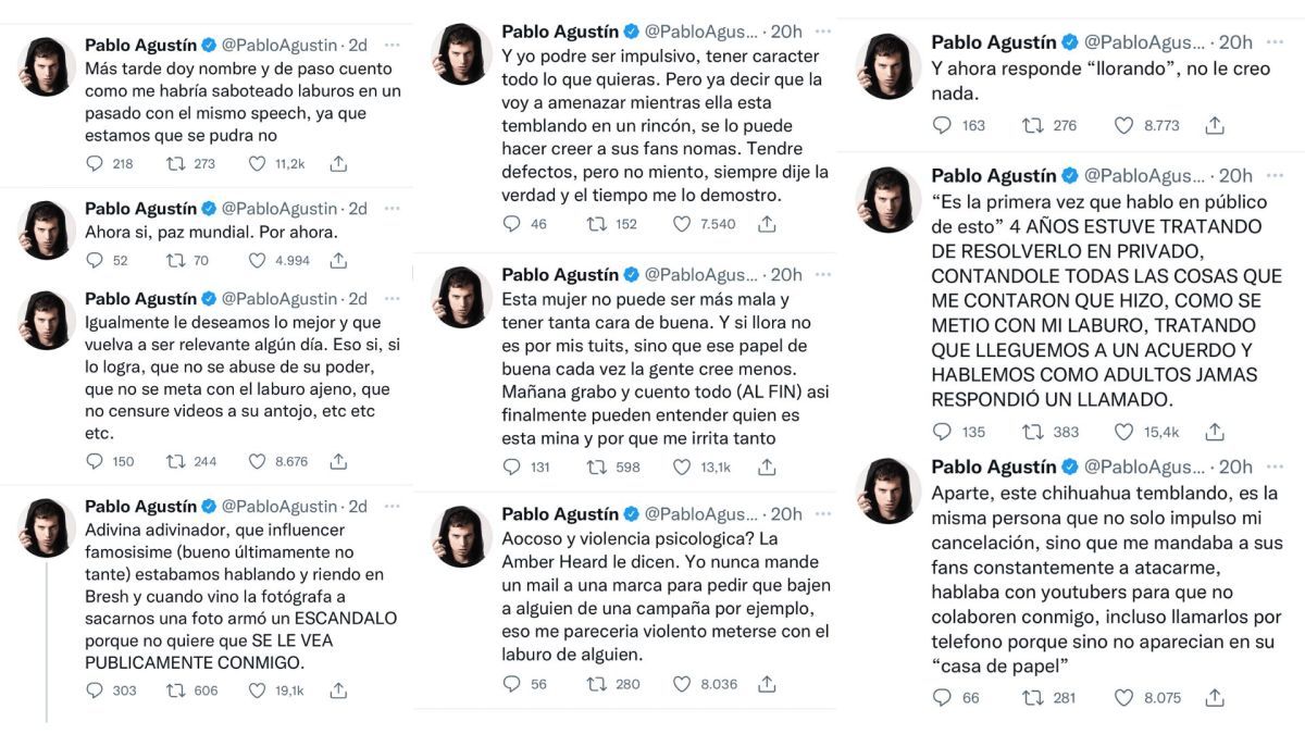 "Adivina adivinador, que influencer famosísime (bueno, últimamente no tanto) estábamos hablando y riendo en Bresh y cuando vino la fotógrafa a sacarnos una foto armó un escándalo porque no quiere que se la vea públicamente conmigo", fue la primera chicana que twitteó Pablo Agustín.