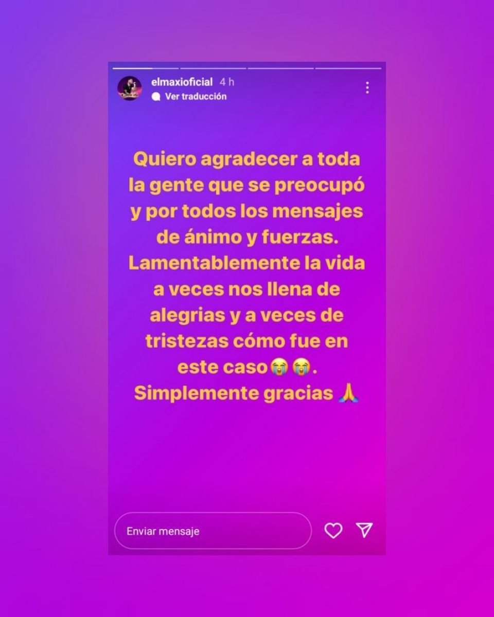 Asimismo, antes de que Morena comunicara al mundo de la perdida del embarazo, el Maxi había realizado un sentido posteo en Stories: "Quiero agradecer a toda la gente que se preocupó y por todos los mensajes de ánimo y fuerzas".