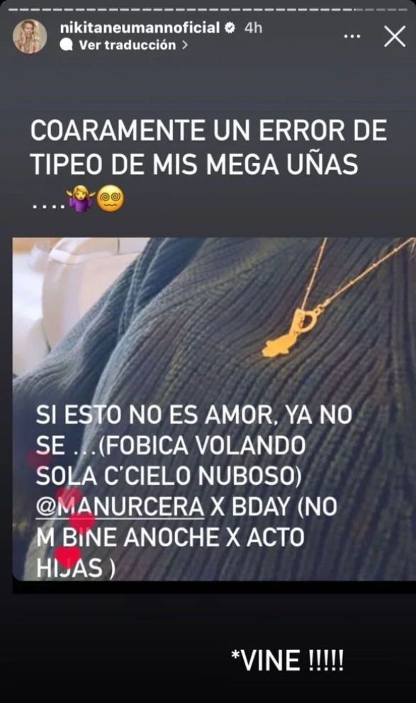 Asimismo, mediante sus stories Nicole explicó: “Ya casi llego a ti amore. Si esto no es amor ya no sé… (fóbica volando sola con cielo nebuloso) Manu Urcera feliz cumpleaños (no me vine anoche por acto de hijas)”.