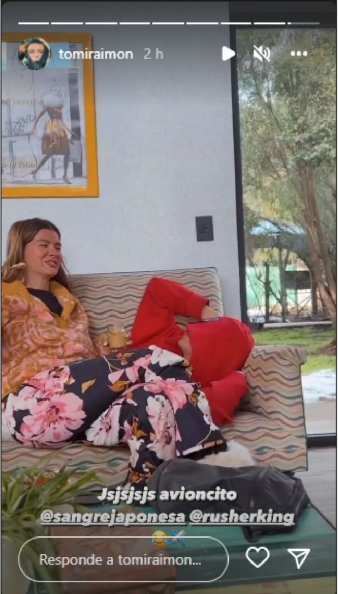 Entre risas, Eugenia le da de comer en la boca a Rusher, que se encontraba recostado sobre sus piernas. En su cuenta de Instagram, el fotógrafo escribió: “Jajajaja, avioncito”.