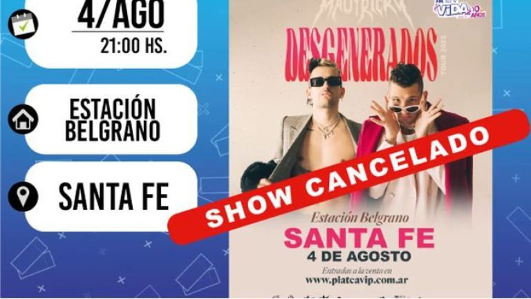 Mau y Ricky Montaner tenían previsto realizar un show en Santa Fe, el 4 de agosto, como parte de las presentaciones de su gira, Desgenerados Tour 2022. Pero en las últimas horas, los organizadores de dicho concierto anunciaron que fue cancelado.