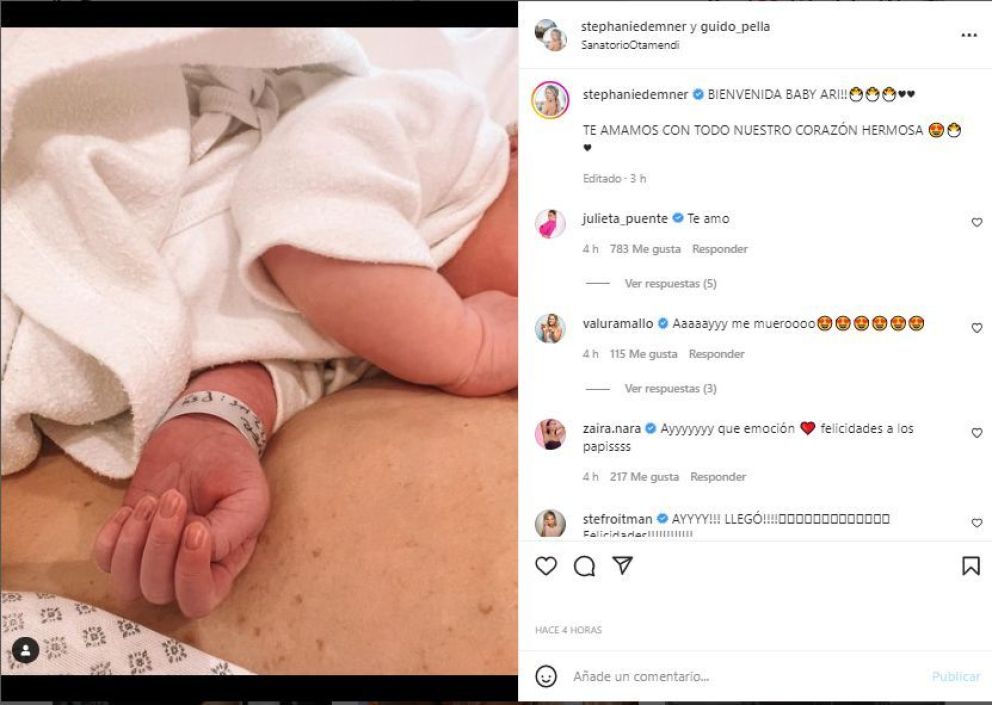 El posteo no pasó inadvertido entre sus seguidores y varias famosas los saludaron, entre ellas Julieta Puente, Paula Chaves y Floppy Tesouro. Además, la modelo subió una foto de su pareja con la nena en brazos y escribió: “Te estábamos esperando”.