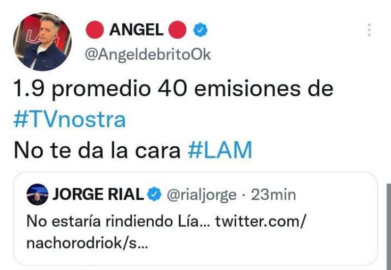 Jorge Rial fue muy crítico por Twitter, durante la entrevista que se le realizó a Lía Salgado en LAM. Acto seguido, Ángel de Brito no dudo y lo cruzó con todo.