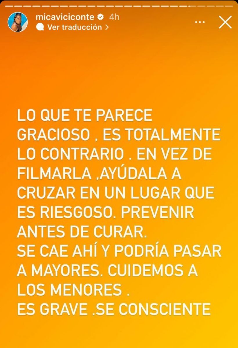 Ante la situación, Mica Vicocente se expresó indignada en redes y compartió su preocupación. "Lo que te parece gracioso, es totalmente lo contrario. En vez de filmarla, ayudala a cruzar en un lugar que es riesgoso. Prevenir antes de curar. Se cae ahí y podría pasar a mayores. Cuidemos a los menores. Es grave. Sé consciente”, afirmó.