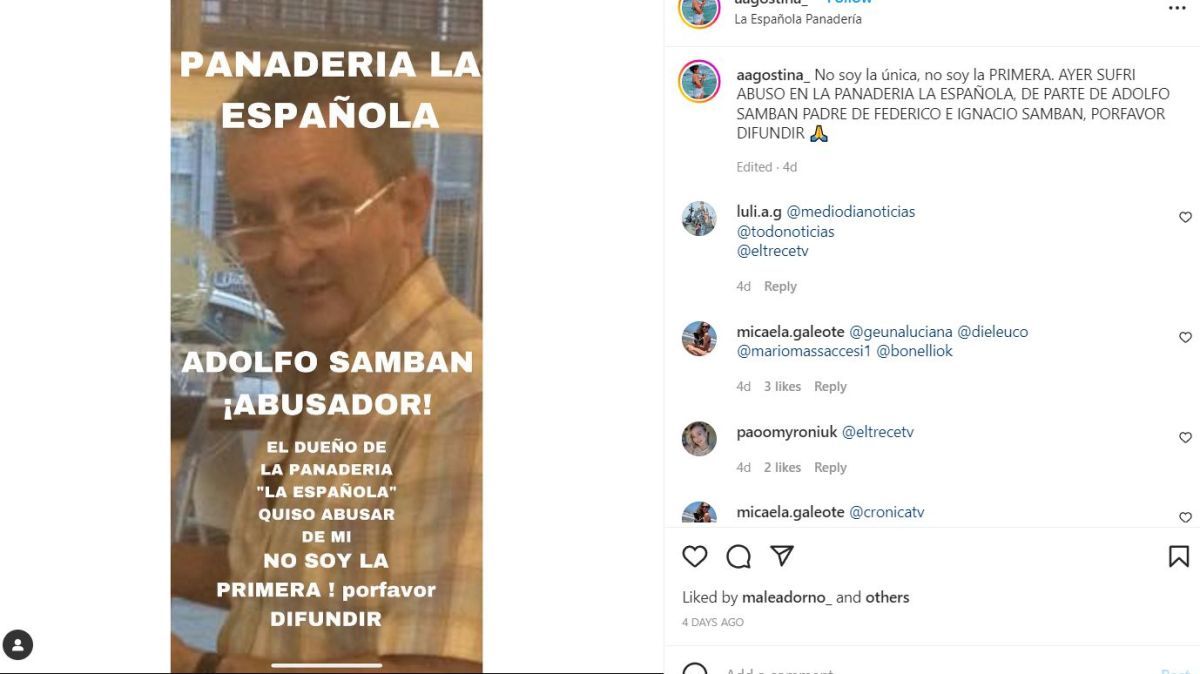 Agostina Signorelli, exempleada de la panadería La Española de Castelar denunció en la Comisaría de la Mujer de Morón haber sido abusada sexualmente por parte del dueño del local, Adolfo Samban.“No soy la única ni tampoco la primera”, destacó.