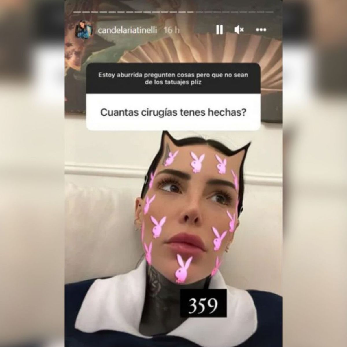 Utilizando la cajita de preguntas, la hija del conductor escribió: “Estoy aburrida. Pregunten cosas, pero que no sea de los tatuajes pliz”. Ante el pedido, una seguidora le pregunto cuántas cirugías tenia y Cande respondió: “359”.