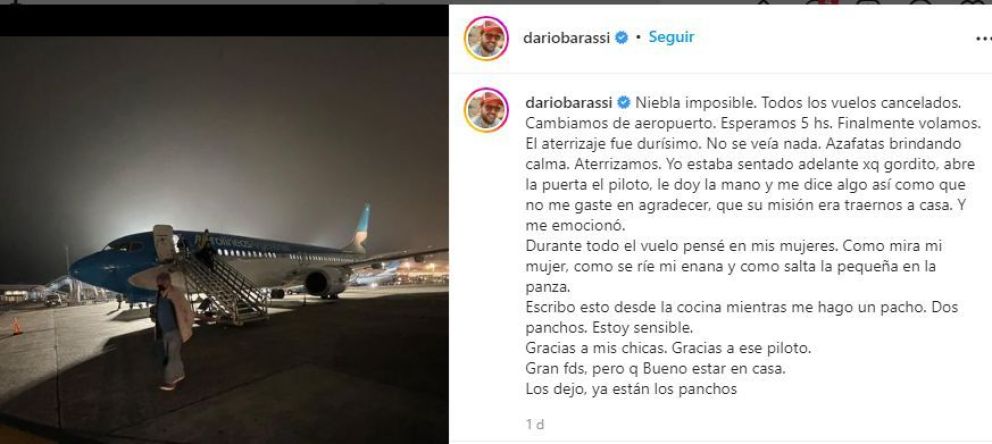 “Niebla imposible. Todos los vuelos cancelados. Cambiamos de aeropuerto. Esperamos 5 hs. Finalmente volamos. El aterrizaje fue durísimo. No se veía nada. Azafatas brindando calma. Aterrizamos”, relató Barassi en su cuenta de Instagram.