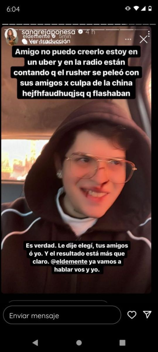 “Amigo no puedo creerlo estoy en un uber y en la radio están diciendo que el Rusher se peleó con sus amigos por culpa de que la China hjfhsjfahajgq qué flasheaban”, soltó. Rápida la actriz compartió el posteo, y contestó con humor: “Es verdad. Le dije 'elegí, tus amigos o yo'. Y el resultado está más que claro. @eldemente ya vamos a hablar vos y yo”.
