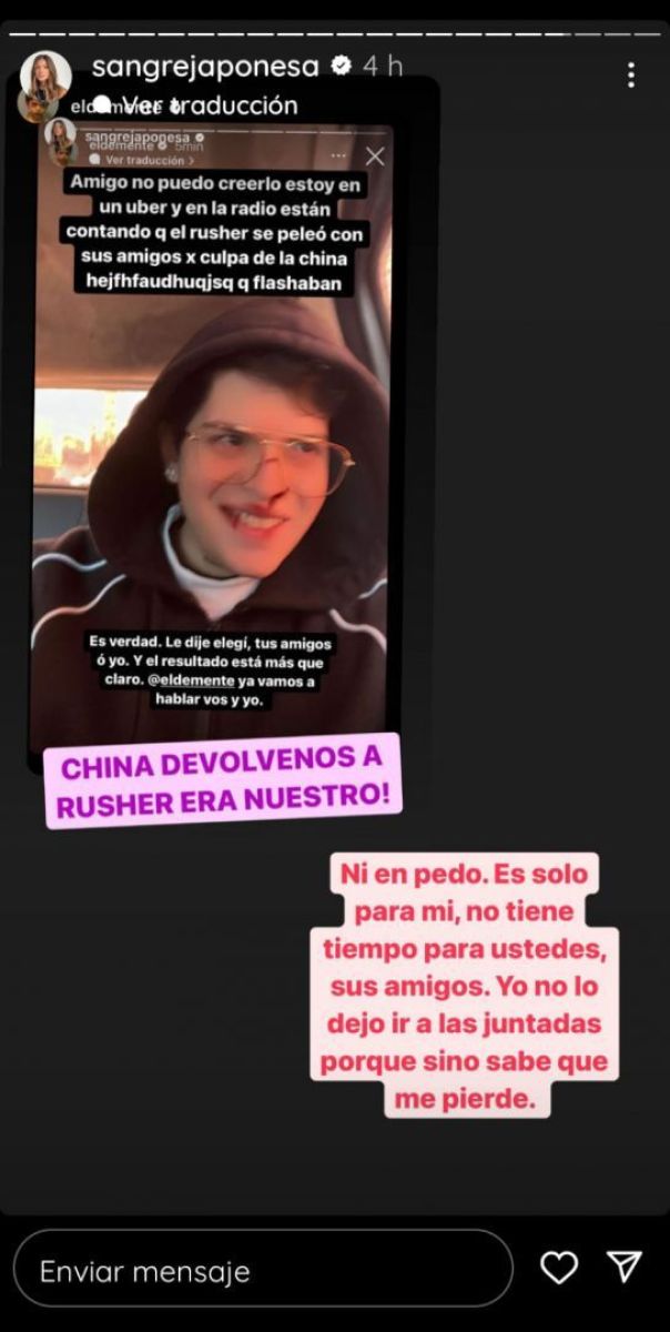 La cosa no terminó ahí, ya que Martín le retrucó: “China devolvemos a Rusher, ¡era nuestro!”. Y ella le respondió en el mismo tono: “Ni en pedo. Es solo para mí, no tiene tiempo para ustedes, sus amigos. Yo no lo dejo ir a las juntadas porque si no sabe que me pierde”.