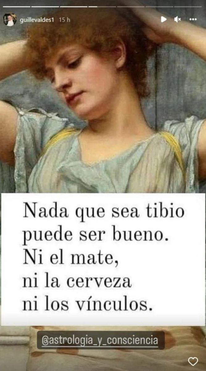 De manera contundente, la frase sobre las relaciones sentimentales no pasó desapercibida."Nada que sea tibio puede ser bueno...", luego sentenció, "Ni el mate, ni la cerveza, ni los vínculos".