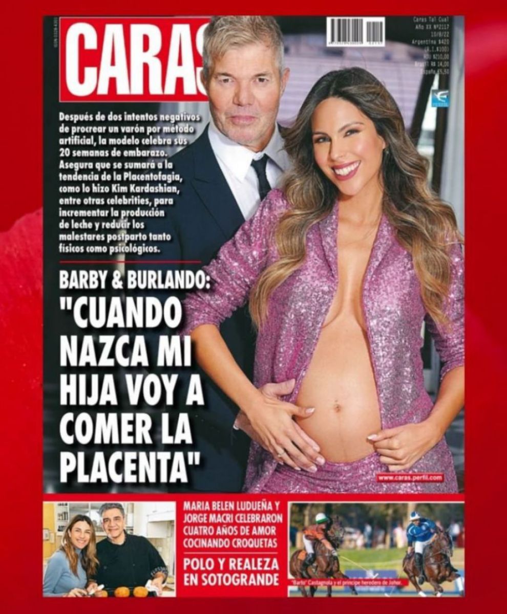 Barby mostró por primera vez su pancita y afirmó que se sumará a la "placentofagia", la decisión que están tomando muchas mujeres luego de ser madres para incrementar la producción de leche y reducir los malestares postparto tanto físicos como psicológicos. "Cuando nazca mi hija, voy a comer la placenta", sostuvo.
