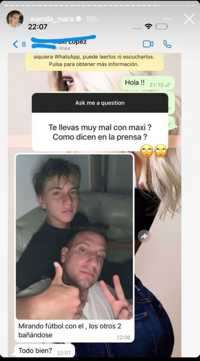 "¿Te llevas muy mal con Maxi?", preguntó una usuaria. A continuación, la empresaria respondió a la pregunta mostrando un chat con su ex pareja, Maxi López. “Mirando fútbol con él, los otros bañándose”, se lee por parte del exfutbolista quien también le envió una foto de él junto a uno de sus hijos.
