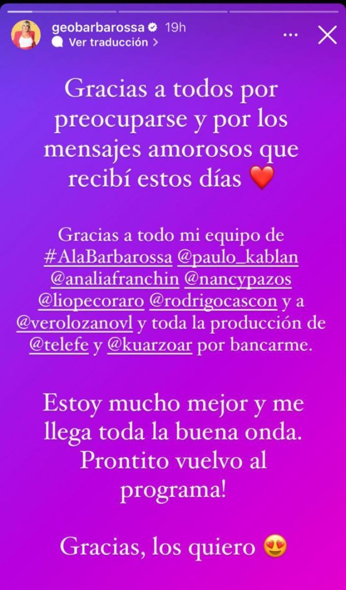 A raíz de distintos estudios, a Georgina los médicos que hiciera reposo y por eso decidió faltar al programa "A la Barbarossa". Sin embargo, luego de su ausencia la actriz escribió unas palabras a través de sus historias de Instagram: "Gracias a todos por preocuparse y por los mensajes amorosos que recibí estos días. Gracias a todo mi equipo y a toda la producción por bancarme".