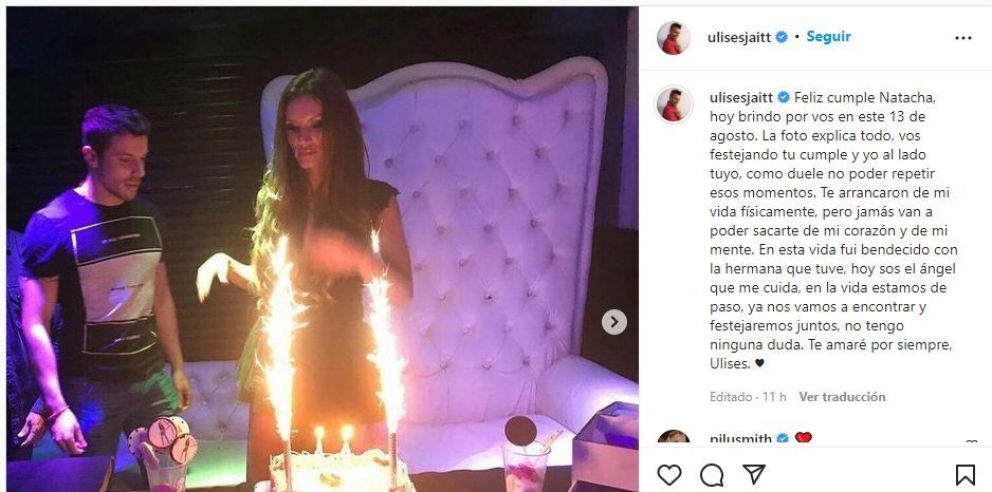 "Feliz cumple Natacha, hoy brindo por vos en este 13 de agosto. La foto explica todo, vos festejando tu cumple y yo al lado tuyo, como duele no poder repetir esos momentos", comienza diciendo Ulises en el posteo.