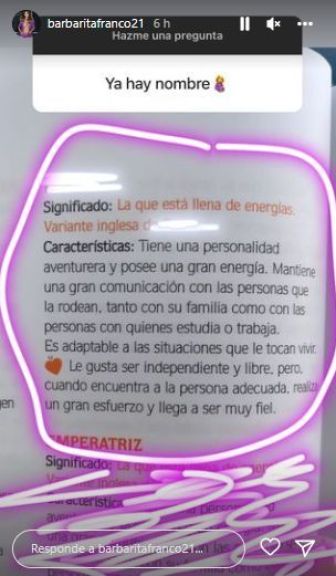 Ahora la modelo dejó otra pista en sus historias de Instagram publicando la descripción del nombre de su hija: "La que está llena de energías". Gracias a esto se sabe que se trata de Emma, variante inglesa de Ema.